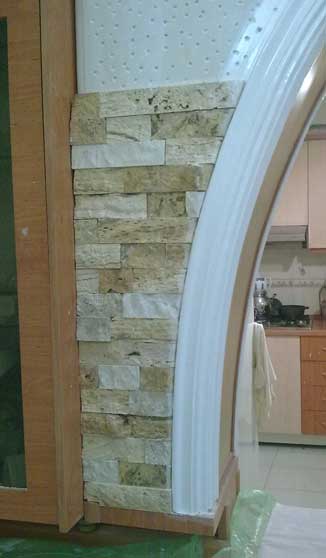 اولین عکس مربوط به دیواره گچبری روی اپن هست که توسط سنگ های 5 سانتی تزئین شده.